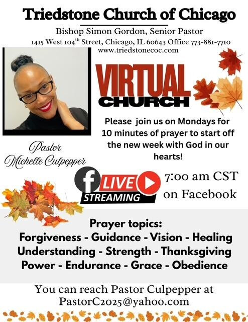 Monday 7 AM Vitrual ChurchEvery Monday, from 09/01/2025 to 11/24/2025, 7:00 AM - 7:15 AM Download: Download Event