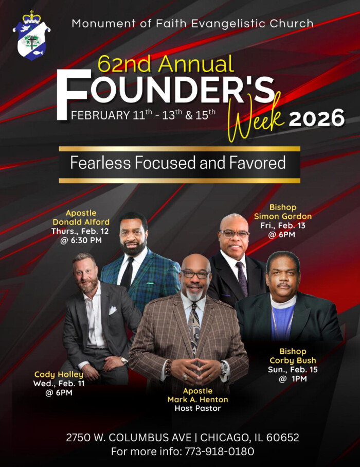 Bishop SpeaksFriday, February 13, 2026, 6:00 PM - 8:00 PM Download: Download EventBishop Speaks 2750 W. Columbus Avenue – Chicago, IL 60652 62nd Founders Week - Apostle Mark Hinton, Host Pastor