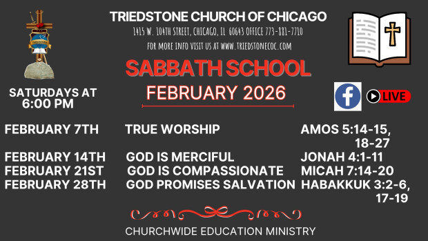 SABBATH SchoolEvery Saturday, from 02/07/2026 to 02/28/2026, 6:00 PM - 6:30 PM Download: Download Event